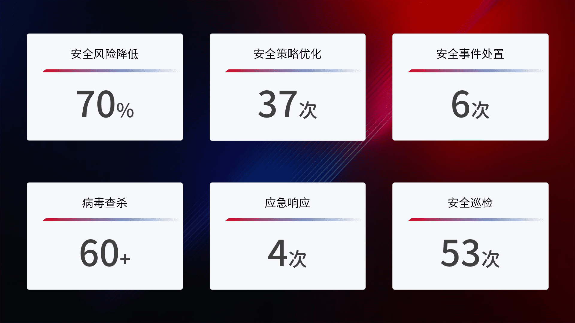 提供全面的安全事件报告体系,,包括处置报告、、、周报、、、季度和年度总结,,,结合持续监控,,,,帮助客户深入了解网络安全状况。。。。